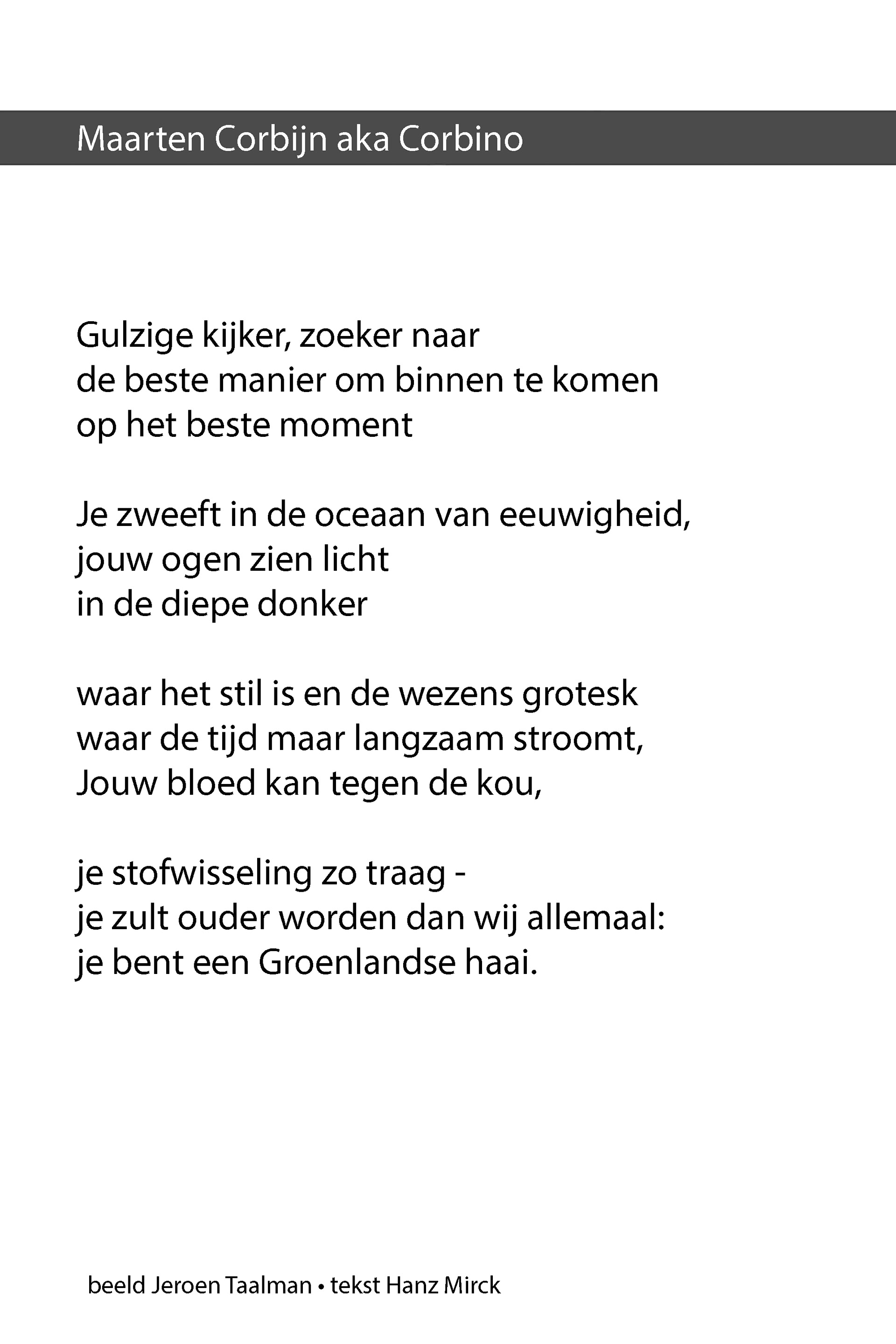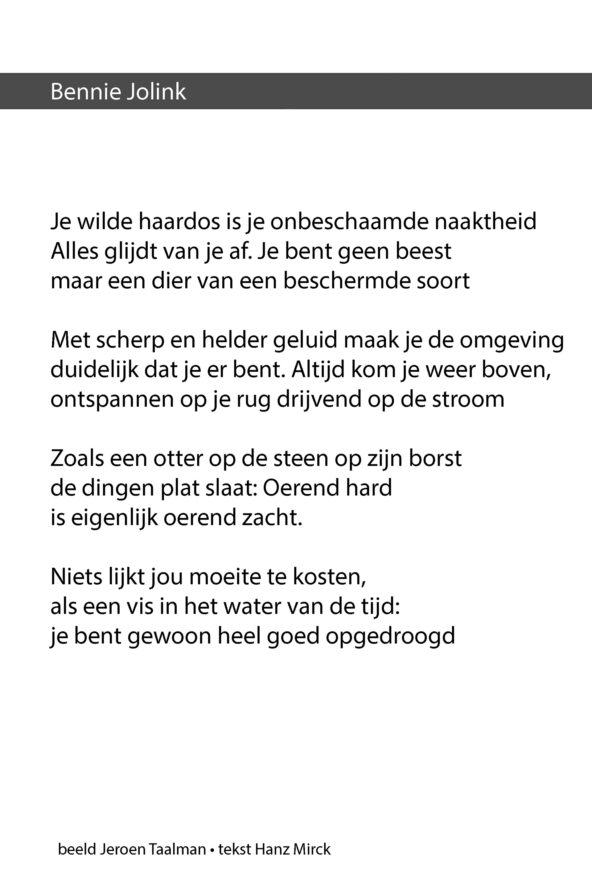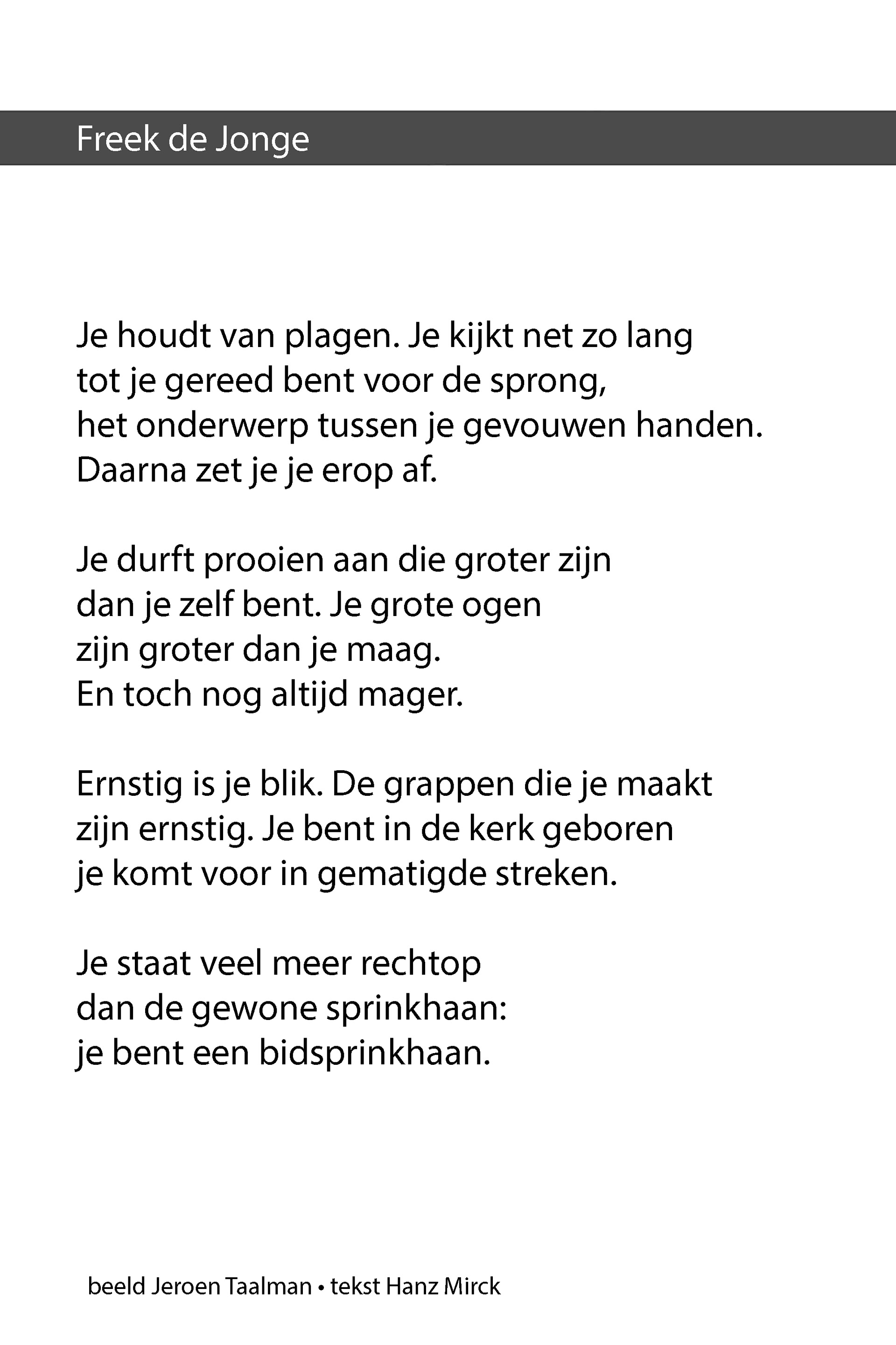 Fotoproject waarbij bekende Nederlanders worden geportretteerd. Dichter Hanz Mirck typeert hen met poëzie als dieren.